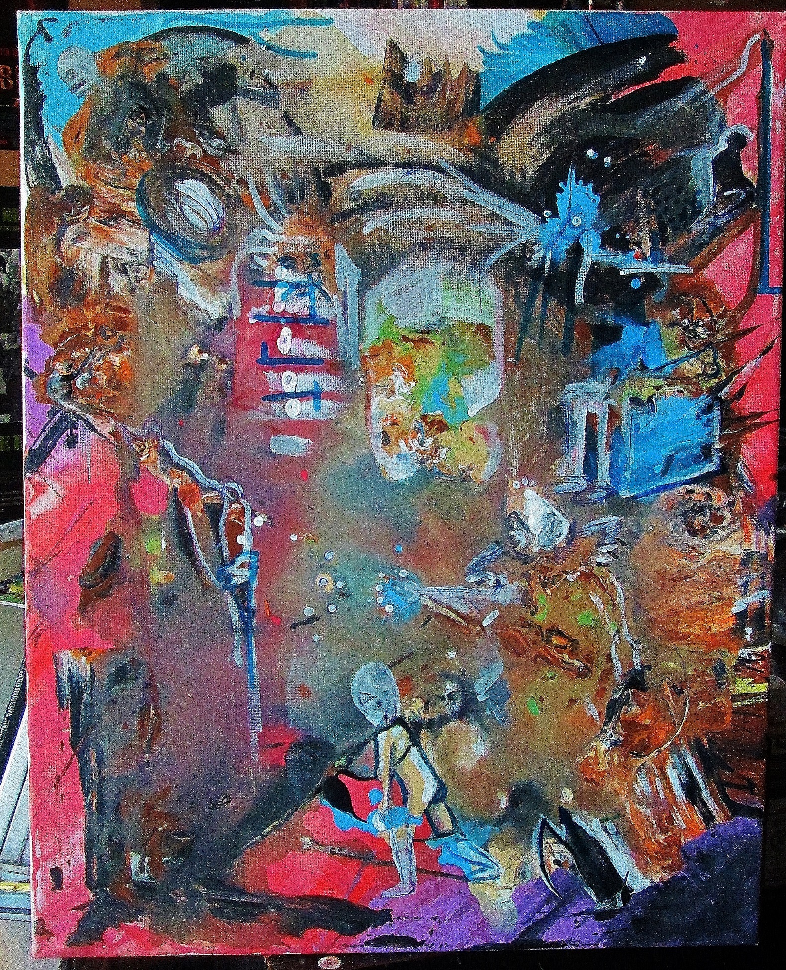 Destruction Attraction is a painting by Ryan Lowrie who was going to call this 16" x 20" acrylic painting on a canvas wrapped wooden board 'Unicorns are Dickheads' but didn't