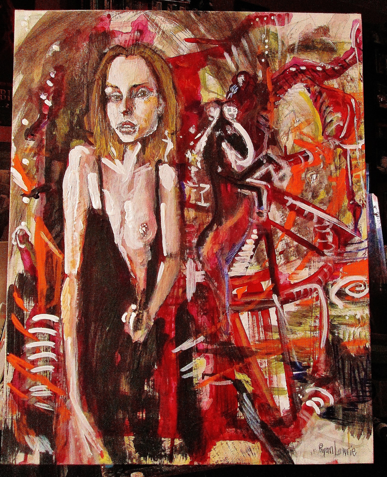 The Playful Present Tense. a painting by Ryan Lowrie. 16" x 20" canvas wrapped board. Mixed media.
