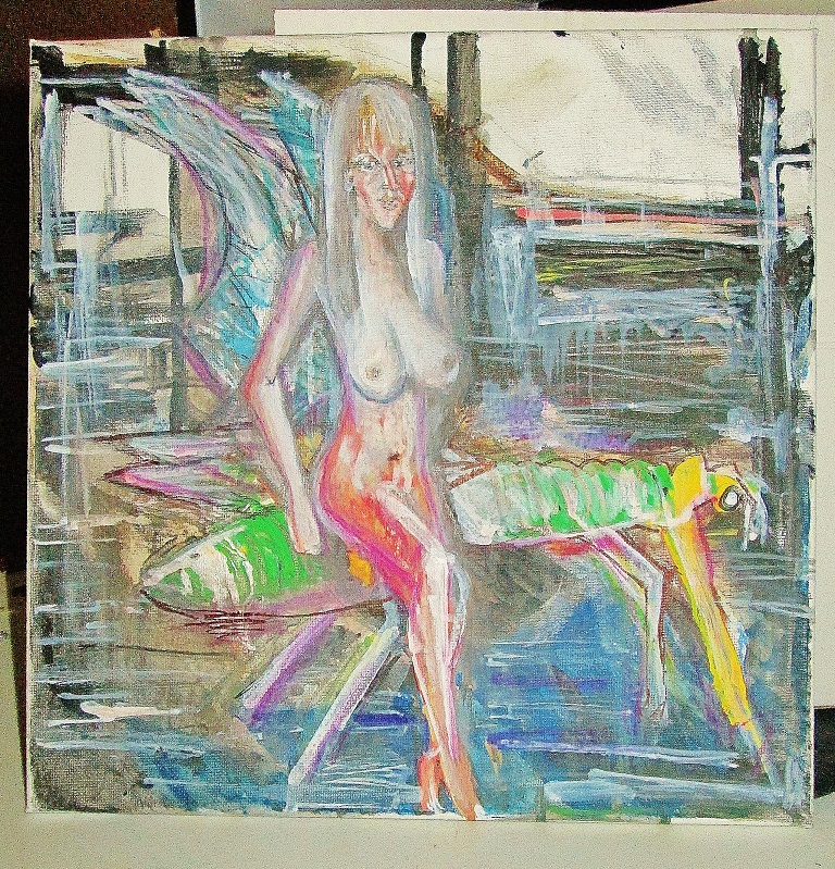 Violet has everywhere to fly to, a painting by Ryan Lowrie onto a 12" x 12" canvas wrapped wooden frame. Mixed media.