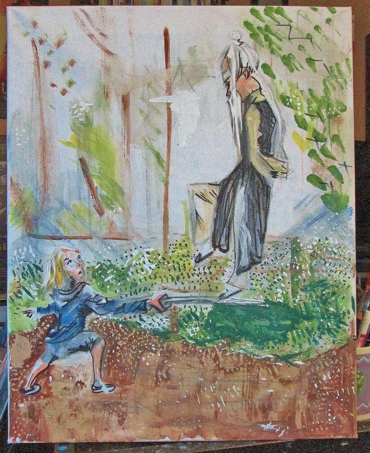Worm fighting an eagle. 16" x 20" mixed media on canvas wrapped wooden frame
