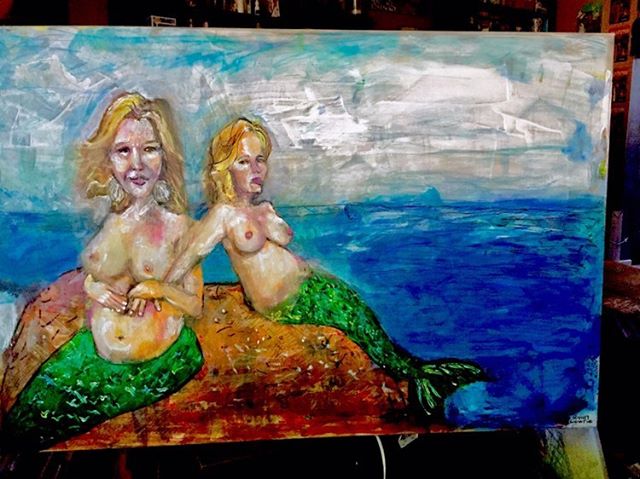 Mermaids on the rocks; 2'x3' painted canvas, mixed media